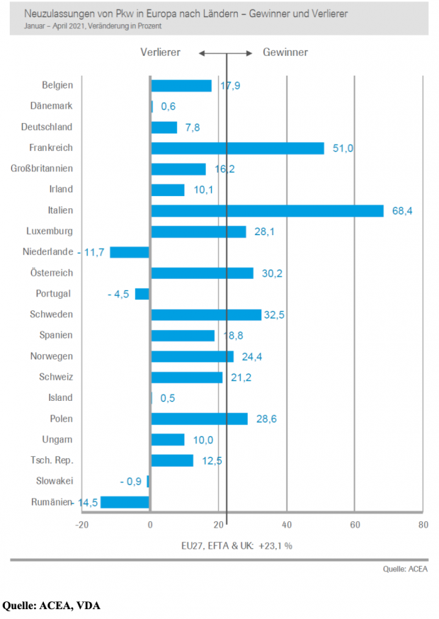 Bis einschließlich April wurden in Europa 4,1 Millionen Neufahrzeuge angemeldet, 23 Prozent mehr als im Vorjahreszeitraum. Sieger und Verlierer sind in der folgenden Grafik ersichtlich: