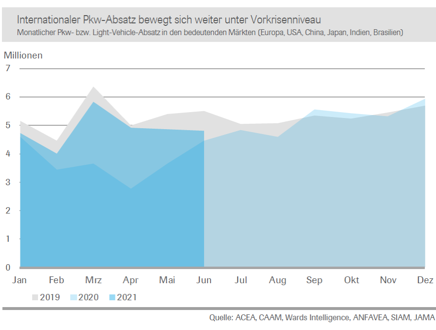 Aktuell kann die gestiegene Autonachfrage weltweit nicht befriedigt werden. Insgesamt wurden bis Juni 2021 in den sieben großen Märkten immer noch 2,7 Millionen (-8 Prozent) weniger Autos abgesetzt als in 2019 (vgl. Schaubild oben). Selbst Hersteller von technisch wenig anspruchsvollen Automodellen sind Gewinner der Mangellage.