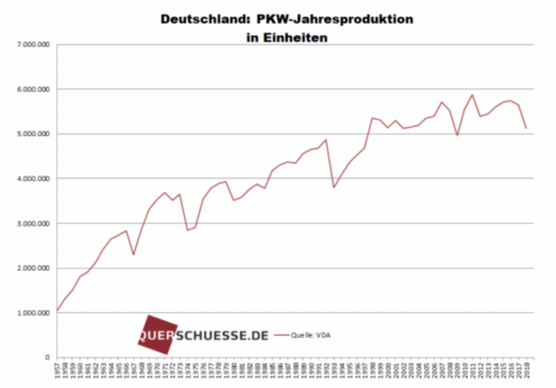 Die Entwicklung der PKW-Produktion in Deutschland von 1957 bis 2018 im Chart. 2018 ging es um -9,4 % zum Vorjahr abwärts, auf den tiefsten Stand seit dem Jahr 2009.