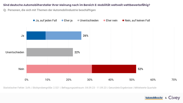 Mehr als jeder zweite Befragte (52 Prozent) sieht die deutschen Hersteller als abgehängt und nicht wettbewerbsfähig an. Insgesamt sagt mehr als jeder Fünfte (21 Prozent), dass die deutschen Hersteller „auf keinen Fall“ mithalten können.