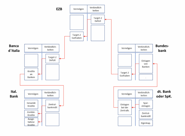 Es sind konkrete Forderungen der Italienischen Zentralbank an eine beliebige Italienische Geschäftsbank, die den Ausgangspunkt der Betrachtung bilden. Sie werden in der Bankbilanz gedeckt und damit „gesichert“ durch die Vermögensseite der Bilanz der gleichen Bank. Wenn aber dieses Vermögen verseucht ist durch ausgefallene Kredite und Kredite an Zombieunternehmen, die nur durch die Subvention des Nullzinses künstlich am Leben erhalten werden, dann ist diese Besicherung wertlos. Es beginnt also damit, dass die Banca d`Italia schon auf unbesicherten Forderungen sitzt, deren Erfüllung daran scheitert, dass die Geschäftsbanken bei korrekter Bilanzierung so ziemlich alle Pleite wären.
