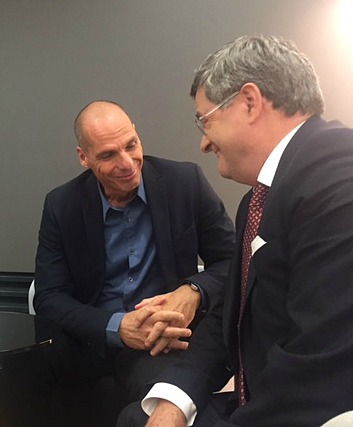 Die Rettungsaktion des Jahres 2010 nennt er ein Verbrechen gegen die Logik: „Griechenland war bankrott. Warum, darüber müssen wir jetzt nicht sprechen. Wir waren einfach pleite. Und die europäische politische Klasse wie auch die griechischen Oligarchen haben gesagt, das muss verdeckt werden. Aber wie kann man so etwas verdecken, wenn man pleite ist? Indem man den Leuten, die pleite sind, Geld gibt. Damit sie sagen können, wir sind nicht pleite. Denken Sie an die neuen Transferzahlungen. Was passiert? Die Gläubiger stecken Geld aus der einen Tasche in die andere. Griechenland behält nicht einen Euro. Sie geben es an die EZB und die anderen Institutionen und Banken. So geht das immer weiter, die Pleite wird hinausgeschoben.“